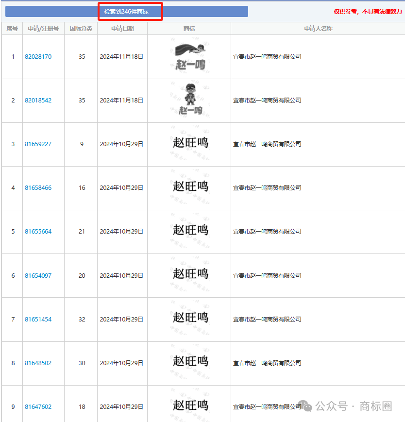 据查询,宣春市赵一鸣商贸无限公司名下目前共计申请246件商标,涉及到肉食蜜饯(29类)、便利食物(30类)、新颖果蔬(31类)、啤酒饮料(32类)、告白发卖(35类)等焦点类别;还有多个防御商标。从这些焦点类别不难看出,赵一鸣不只沉视对本身从营零食产物相关类此外商标把控,像肉食蜜饯、便利食物等,以此来保障从打产物的品牌标识性;同时也将目光投向了如告白发卖等范畴,通过正在这些类别注册商标,为品牌宣传推广等贸易运营勾当建牢根本。值得留意的是,赵一鸣还十分注沉防御商标的结构。其246枚商标中,“赵一鸣”商标仅有110枚,其余的满是防御商标。