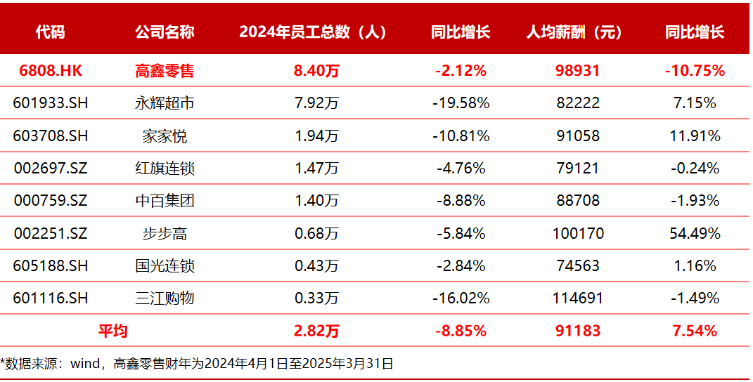 7月,高鑫零售交出了易从后的第一份财报,公司2025财年收入为715。52亿元,较客岁下降1。4%;净利润3。86亿元,同比扭亏。相较于2024财年营收削减13。3%,归母净利润-16。68亿元的数据来看有所好转。而公司扭亏的主要缘由之一是“降本增效”,企业发卖及运营开支为人平易近币152。32亿元,较同期削减29。46亿元,同比减幅达16。2%。同期,整个行业也身处逆风,保守大卖场不只要应对房钱、人力等成本压力,还面对来自零食扣头店、立即零售等新业态的多沉冲击。按照中国连锁运营协会本年7月发布的“2024 年中国超市 TOP100” 榜单显示,2024年超市TOP100企业发卖规模约为9000亿元,同比下降9。8%,全体呈现 “规模增加乏力、门店收缩” 的态势。截至2025年3月底,高鑫零售共有员工8。4万人,规模仍居行业前列,但员工总数已持续三年下降,过去三年降幅别离为2。12%、20%和11。66%。正在人员布局方面,公司大幅添加兼人员工比例,2025财年兼职人员同比上升35。23%,达到1。4万人;而全人员工则进一步削减12。46%,当前为6。9万人。这一变化并非个例。整个商超业正在2024年遍及呈现员工总量负增加,遍及通过优化组织布局,节制人力成本以应对市场压力。以国内上市的超市为例,行业平均员工数同比下降8。85%。虽然行业全体正在“减员”,但人均薪酬根基连结不变。按照上市商超年报中披露的薪酬收入数据,2024年零售行业平均人均薪酬为91183元,不外,高鑫零售的人均薪酬增加表示却显著低于行业程度,2025财年,公司人均薪酬为9。89万元,同比削减10。75%,成为行业中少数呈现较大幅度薪酬缩水的企业。